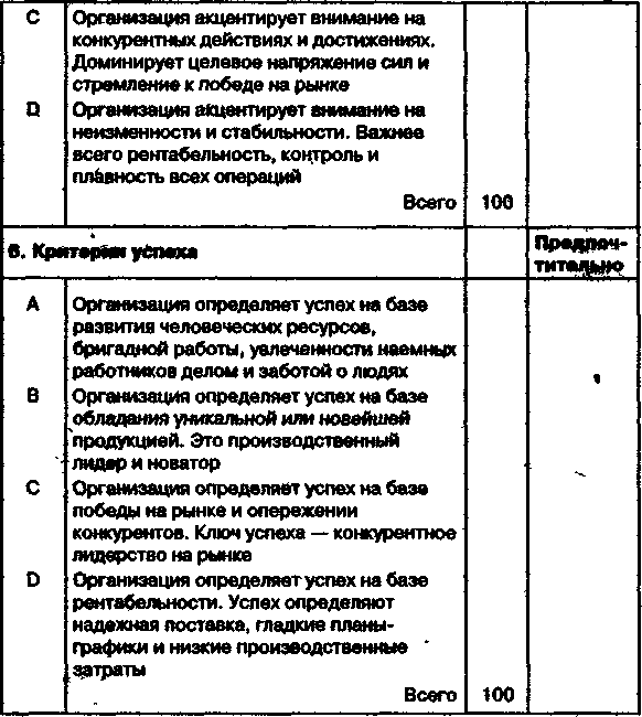 Вэтой главе мы представляем инструмент оценки организационной культуры (OCAI) (см. табл. 2.1), предназначенный для диагностики культуры вашей организации. Он имеет форму «опросника, требующего индивидуальных ответов по шесте пунктам. Хотя существует множество способов оценки организационной культуры (их обсуждение см. в приложении I), данный инструмент преследует цель результативной и тщательной диагностики именно тех важных аспектов организации, которые определяют фундамент ее культуры. Он был опробован более чем на тысяче известных нам организаций и доказал свою способность предсказывать показатели деятельности организаций. Предназначение предлагаемого инструмента оценки — оказание помощи в деле идентификации существующей культуры организации. Но это только первый шаг. тот же инструмент помогает достаточно четко определить культуру, к которой члены организации намереваются прийти, чтобы соответствовать требованиям внешнего окружения и вызовам будущего, перед лицом которых может оказаться компания. Это второй шаг.