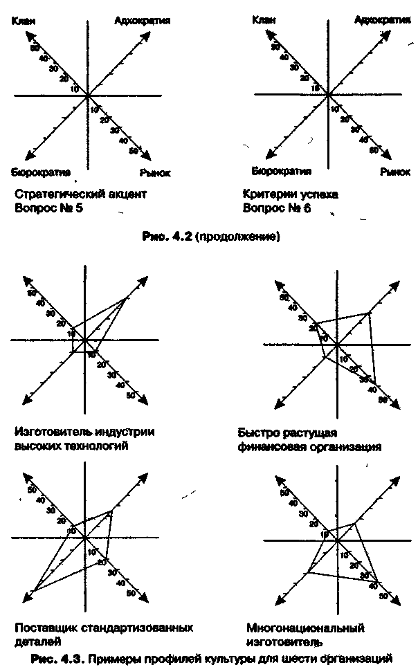 Рис. 4.3 иллюстрирует примеры шести организационных профилей культуры. Эти диаграммы не являются ни стереотипными, ни идеальными; они сделаны для шести произвольно выбранных организаций, имеющих несколько отличный от других профиль. Мы приводим здесь эти примеры лишь для показа широкого многообразия профилей культуры, которые могут сложиться в организациях. Например, изготовитель средств-измерений и измерительных приборов, являющий» представителем индустрии высоких технологий, тяготеет каф хократическому квадранту. Выживание его организации, завн-сит от быстрых и постоянных новаторских решений Щ) обкевг лению продукции и услуг в чрезвычайно бурно меняющемся внешнем окружении. Быстрорастущая финансовая организация, которая делает акцент культуры на правой стороне профиля — адхократии и рынке, — встречается нечасто, но в предыдущей главе мы упоминали пример Meridian. У большинства банков выявляется как раз зеркальное отражение этого профиля. У поставщика стандартизованных деталей доминирует иерархическая культура, а второй по степени преобладания является адхократия.