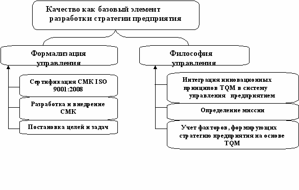 Второй элемент – внедрение философии управления на основе TQM - формирует эффективную систему управления, опирающуюся на философию «качества и стратегического менеджмента» и нацелен на формирование у персонала предприятия идеи качественной организации. Внедрение двух элементов приводят к формированию качества как базового элемента стратегии развития предприятия на основе TQM. Двусторонний подход сертифицированной системы менеджмента качества с одной стороны и внедрение философии управления на основе TQM с другой, позволяют включить качество в систему разработки стратегии предприятия.