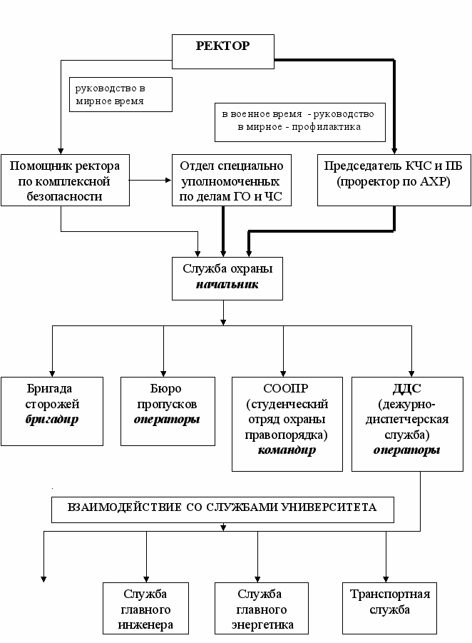 | - служба охраны | Об основных функциях, изменениях в структуре и штатах, изменении контактных телефонов, о любых чрезвычайных происшествиях, несущих информацию об угрозе или возникновении ЧС на территории университета, выполнении поручений, приказов по направлениям функционирования | Информирование о фактах возникновения ЧС, необходимости привлечения специалистов подразделения для ликвидации последствий происшествий и ЧС |