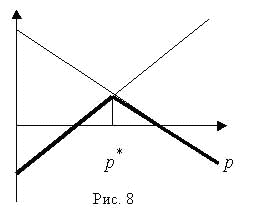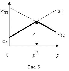 . Минимум из этих двухвыигрышей на рисунке нарисован жирной линией, из которой ясно, как определяется гарантированный выигрыш