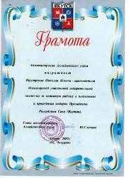 | 2010 | Почетная грамота За плодотворную работу в системе образования, успехи в воспитании и обучении подрастающего поколения | МО РС(Я) |