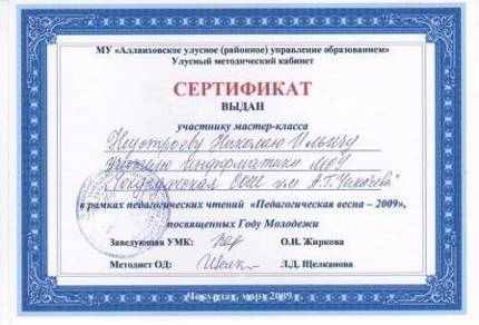 | 2010 | Благодарность За техническую поддержку улусного семинара | Управления образования Аллаиховского улуса |