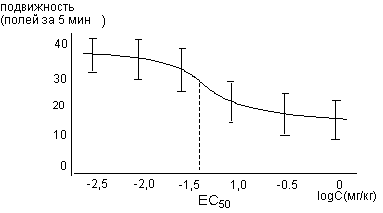 Кривая "доза-эффект" для оценки обездвиживающего действия нейролептика аминазина при внутрибрюшинном введении крысам. Каждая точка на графике получена путем регистрации эффектов, полученных у 10 - 20 животных.