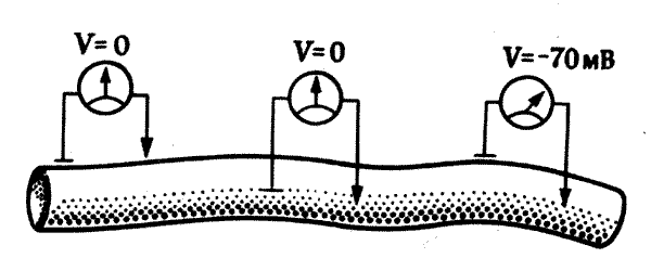 Рис. 7.1. Мембранный потенциал покоя. Если на поверхность нервного волокна (или любой другой клетки) наложены два регистрирующих электрода, разность потенциалов между ними отсутствует. То же самое наблюдается, если оба электрода введены внутрь волокна. Но если один из них находится на поверхности, а другой внутри, то внутри волокна регистрируется потенциал около -70 милливольт по отношению к поверхности. Это мембранный потенциал покоя; он обусловлен биохимическими и физическими свойствами мембраны, которые приводят к различиям в концентрациях натрия, калия и других ионов по обе ее стороны.
