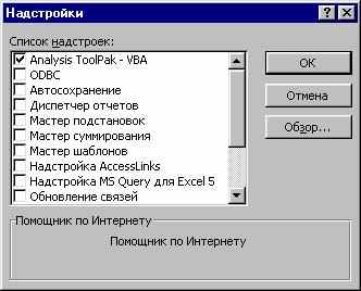 - Раскройте пункт меню Сервис. Если в выпавшем подменю нет команды Анализ данных, то выполните команду Сервис, Надстройки. В появившемся окне Надстройки (рис. 9.2) в списке надстроек установите флажок слева от строки Analysis ToolPak - VBA (функции VBA для работы пакета анализа) и щелкните на кнопке ОК.