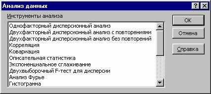 Выполните команду Сервис, Анализ данных. Появится окно Анализ данных (рис. 9.3). Пролистайте список инструментов анализа и обратите внимание на то, что их достаточно много.
