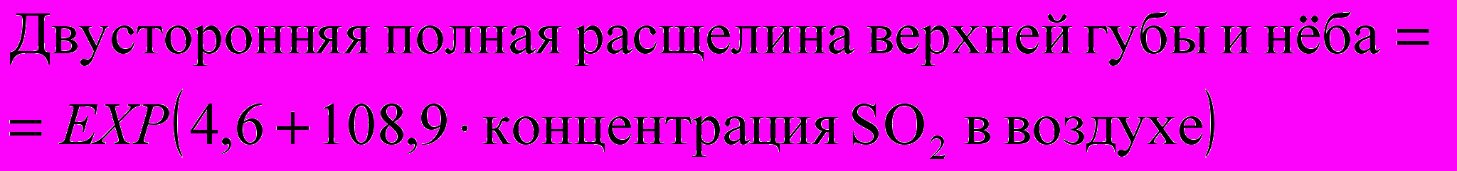 Нами получено статистически достоверное (R=0,8; R2=0,7; р<0,05) влияние концентрации SO2 на заболеваемость детей двусторонней сквозной расщелиной верхней губы и нёба: