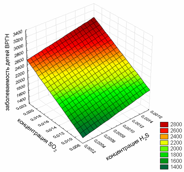 Из данного рисунка видно, что заболеваемость детей ВРГН будет увеличиваться в 1,9 раз при росте концентрации H2S на 0,001 мг/м3 (12,5 % ПДК), а возрастание концентрации SO2 на 0,01 мг/м3 (20 % ПДК) увеличит показатель заболеваемости в 1,4 раза.
