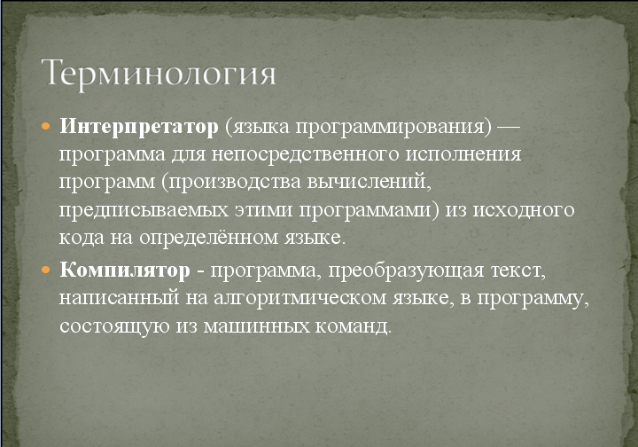 Интерпретатор (языка программирования) — программа для непосредственного исполнения программ (производства вычислений, предписываемых этими программами) из исходного кода на определённом языке.