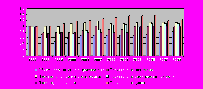 исунок 4. Динамика выпуска некоторых металлов в 1997-2008 гг. по отношению к 1990 г. *