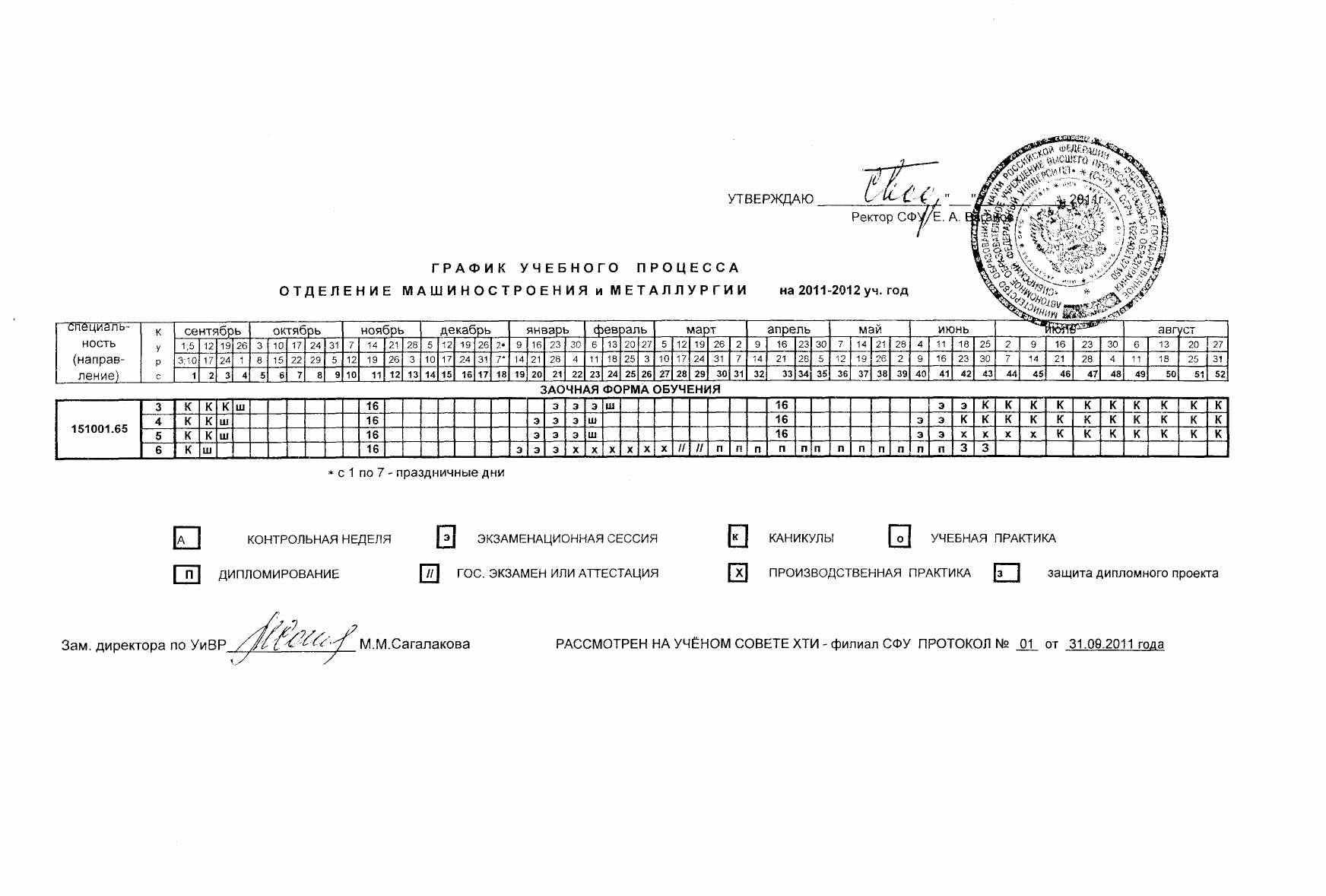 | ХТИ – филиал СФУ Отделение машиностроения и металлургии | Учебный график специальности 151001.65 Технология машиностроения на 2011–2012 уч. год | Курс 6, Семестр 11 Срок обучения 6 лет | |||||||||||
