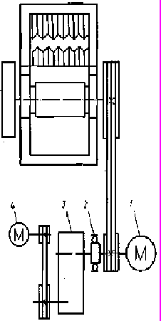 Он состоит из электродвигателя меньшей мощности 4, зубчатого редуктора 3 с большим передаточным числом, обгонной муфты 2, соединенной с валом главного электродвигателя 1. Трогание с места осуществляется вспомогательным приводом. После этого включается главный двигатель, а вспомогательный привод автоматически отключается.