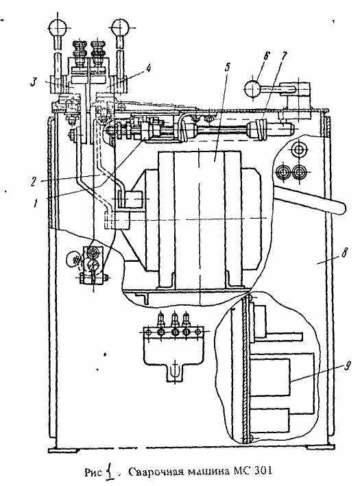машинах применяют направляющие на роликах или шарика, пружинный или пневматический привод перемещение, рычажные эксцентриковые или пневматические зажимы. Машины также снабжаются устройствами для термообработки на тиристорах с автоматическими схемами управления и вряде случаев с оптическими пирометрами для измерения температуры. Для снижения и стабилизации РС в машинах предусматриваются малые массы подвижных частей и пересекаются токоподводы, которые создают из одного контура два с двумя встречно действующими электромагнитными силами. В некоторых машинах подогрев при малом давлении завершается его повышением в 3…5 раз при осадке.Машина МС – 301 (рис. 1) мощностью W = 5 кВ * А (ПВ = 12, 5 %), током I2 н = 3,2 кА рассчитана на сварку деталей сочетание 500 мм2. Машина имеет корпус 8, на верхней плите которого закреплен неподвижный зажим 3. Подвижный зажим 4 установлен на качающемся рычаге 2, эксцентриковая ось которого закреплена в отверстиях на передней и задней стенах корпуса. Зажим – ручные, с радиальным ходом. В корпусе установлены трансформатор 5 с переключателем ступеней, блок управления 9 и система охлаждения. Спереди на корпусе размешена сигнальная лампочка, кнопка «Стоп» и отрезное устройства. Расстояние между зажимам регулируют винтом 1, через который передается усилие осадки РОС, создаваемое пружиной 7. Полное усилие осадки создается поворотом до упора рычага 6 с кривошипом. На рычаге 6 установлена пусковая кнопка для включения сварки. Команда на выключение сварочного тока подается конечным выключателем, установленным на внутренней поверхности верхней плите.