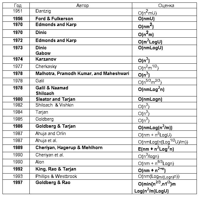 В заключение приведем сводную хронологическую таблицу результатов, полученных для задачи о максимальном потоке (везде далее n – число вершин сети, m – число ребер, U – максимальная пропускная способность ребер сети)