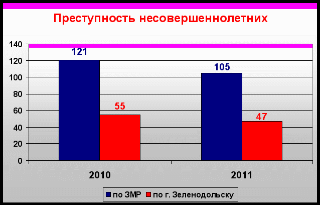 По итогам 2011 года произошло существенное снижение преступлений, совершенных несовершеннолетними, по району - на 13,2 процента, со 121 до 105, в том числе по городу - на 14,5 процентов, со 55 до 47.