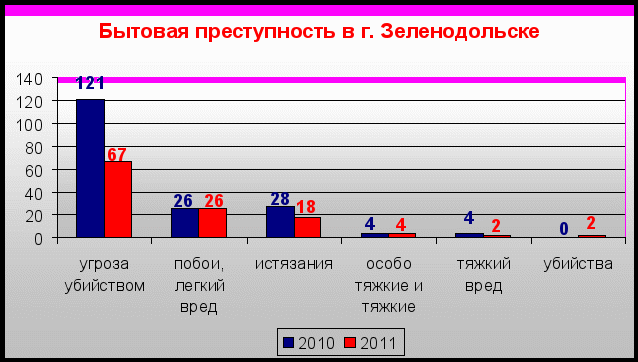 Участковыми уполномоченными целенаправленно проводилась профилактическая работа с лицами, совершающими правонарушения и преступления в сфере семейно-бытовых отношений, выявлялись и привлекались к ответственности домашние дебоширы. Работа по выявлению превентивных преступлений позволила не допустить роста зарегистрированных особо тяжких и тяжких бытовых преступлений, их количество осталось на уровне 2010 года – 4. В 2 раза меньше совершено умышленных причинений тяжкого вреда здоровью (с 4 до 2), в тоже время с 0 до 2 возросло количество убийств, совершенных на бытовой почве.