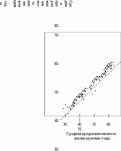 Б. Ц. Урланис (1965) отмечал, что в СССР, как и в большинстве других стран мира, имеет место более медленное увеличение продолжительности жизни мужчин по сравнению с женщинами. Разница в продолжительности жизни в современной России с её грузом накопленных политических и экономических проблем составляет около 12 лет. Меньшая средняя продолжительность жизни мужчин хорошо видна на Рис. 2.2 (Гаврилов, Гаврилова, 1991). Большинство точек, каждая из которых соответствует той или иной стране в определенное время, лежат выше биссектрисы прямого угла, которая соответствует равной длительности жизни.