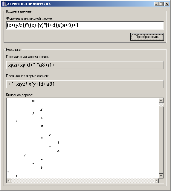 Все описанные алгоритмы (перевод в постфиксную и префиксную форму записи) реализованы в программе, написанной на объектно-ориентированном языке программирования Borland C++ Builder 4.