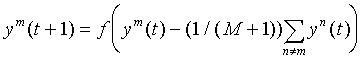 Принцип WTA (Winner Take All) - Победитель Забирает Все - в модели Липпмана-Хемминга Рассмотрим задачу о принадлежности образа некоторому классу Xk, определяемому заданными библиотечными образами xk. Каждый из заданных образов обучающей выборки непосредственно определяет свой собственный класс, и таким образом, задача сводится к поиску "ближайшего" образа. В случае двух двоичных (0-1) образов расстояние между ними может быть определено по Хеммингу, как число несовпадающих компонент. Теперь после вычисления всех попарных расстояний искомый класс определяется по наименьшему из них. Нейросетевое решение этой задачи может быть получено на основе архитектуры Липпмана-Хемминга. Сеть имеет один слой одинаковых нейронов, число которых равно количеству классов. Таким образом, каждый нейрон "отвечает" за свой класс. Каждый нейрон связан с каждым из входов, число которых равно размерности рассматриваемых библиотечных образов. Веса связей полагаются равными нормированным библиотечным образам:   Здесь - значение веса связи от n-го входа к m-му нейрону (см. рис.6.8). Процесс поступления информации о векторе в нейронную сеть является безитерационным. При этом входной вектор сначала нормируется:  и нейроны принимают начальные уровни активности:  Здесь f(x) - переходная функция (функция активации) нейрона, которая выбирается равной нулю при x<0, и f(x)=x при x>0. Пороги полагаются обычно равными нулю.  Рис. 6.8. Нейронная сеть Липпмана-Хемминга. При поступлении входного вектора начальное возбуждение получают все нейроны, скалярное произведение векторов памяти которых с входным вектором превышает порог. В дальнейшем среди них предстоит выбрать один, для которого оно максимально. Это достигается введением дополнительных обратных связей между нейронами, устроенных по принципу "латерального торможения". Каждый нейрон получает тормозящее (отрицательное) воздействие со стороны всех остальных нейронов, пропорционально степени их возбуждения, и испытывает возбуждающее (положительное) воздействие самого на себя. Веса латеральных связей в нейронном слое нормируются таким образом, что суммарный сигнал является возбуждающим только для нейрона с максимальной исходной активностью. Остальные нейроны испытывают торможение:  По выполнении некоторого числа итераций t для всех нейронов кроме одного значение аргумента функции f(x) становится отрицательным, что обращает их активность ym в нуль. Единственный, оставшийся активным, нейрон является победителем. Он и указывает на тот класс, к которому принадлежит введенный образ. Такой механизм получил название "Победитель-Забирает-Все" ( Winner Take All - WTA ). Механизм WTA используется и в других нейросетевых архитектурах. Заложенный в его основе принцип латерального торможения имеет глубокие биологические основания и весьма широко распространен в нейронных сетях живых организмов. Нейросетевая парадигма Липпмана-Хемминга является моделью с прямой структурой памяти. Информация, содержащаяся в библиотечных образах никак не обобщается, а непосредственно запоминается в синаптических связях. Память здесь не является распределенной, так как при выходе из строя одного нейрона полностью теряется информация обо всем соответствующем ему образе памяти. Карта самоорганизации Кохонена В противоположность хемминговой сети модель Кохонен