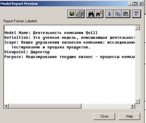 Точка зрения (Viewpoint). Под точкой зрения понимается перспектива, с которой наблюдалась система при построении модели. Хотя при построении модели учитываются мнения различных людей, все они должны придерживаться единой точки зрения на модель. Точка зрения должна соответствовать цели и границам моделирования. Как правило, выбирается точка зрения человека, ответственного за моделируемую работу в целом. IDEF0-модель предполагает наличие четко сформулированной цели, единственного субъекта моделирования и одной точки зрения. Для внесения области, цели и точки зрения в модели IDEF0 в BPwin следует выбрать пункт меню Model/Model Properties, вызывающий диалог Model Properties (рис. 7.3). В закладке Purpose следует внести цель и точку зрения, а в закладку Definition — определение модели и описание области. ![]() Рис. 7.3. Диалог задания свойств модели В закладке Status того же диалога можно описать статус модели (черновой вариант, рабочий, окончательный и т. д.), время создания и последнего редактирования (отслеживается в дальнейшем автоматически по системной дате). В закладке Source описываются источники информации для построения модели (например, «Опрос экспертов предметной области и анализ документации»). Закладка General служит для внесения имени проекта и модели, имени и инициалов автора и временных рамок модели — AS-IS и ТО-ВЕ. Модели AS-IS и ТО-ВЕ. Обычно сначала строится модель существующей организации работы — AS-IS (как есть). Анализ функциональной модели позволяет понять, где находятся наиболее слабые места, в чем будут состоять преимущества новых бизнес-процессов и насколько глубоким изменениям подвергнется существующая структура организации бизнеса. Детализация бизнес-процессов позволяет выявить недостатки организации даже там, где функциональность на первый взгляд кажется очевидной. Найденные в модели AS-IS недостатки можно исправить при создании модели ТО-ВЕ (как будет) — модели новой организации бизнес-процессов. Технология проектирования ИС подразумевает сначала создание модели AS-IS, ее анализ и улучшение бизнес-процессов, то есть создание модели ТО-ВЕ, и только на основе модели ТО-ВЕ строится модель данных, прототип и затем окончательный вариант ИС. Иногда текущая AS-IS и будущая ТО-ВЕ модели различаются очень сильно, так что переход от начального к конечному состоянию становится неочевидным. В этом случае необходима третья модель, описывающая процесс перехода от начального к конечному состоянию системы, поскольку такой переход — это тоже бизнес-процесс. Результат описания модели можно получить в отчете Model Report. Диалог настройки отчета по модели вызывается из пункта меню Tools/Reports/Model Report. В диалоге настройки следует выбрать необходимые поля, при этом автоматически отображается очередность вывода информации в отчет (рис. 7.4). ![]() Рис. 7.4. Диалоговое окно для формирования отчета по модели На рис. 7.5 представлен отчет, сформированный по вышеуказанным полям. ![]() Рис. 7.5. Предварительный просмотр отчета Основу методологии IDEF0 составляет графический язык описания бизнес-процессов. Модель в нотации IDEF0 представляет собой совокупность иерархически упорядоченных и взаимосвязанных диаграмм. Каждая диаграмма является единицей описания системы и располагается на отдельном листе. Модель может содержать четыре типа диаграмм: