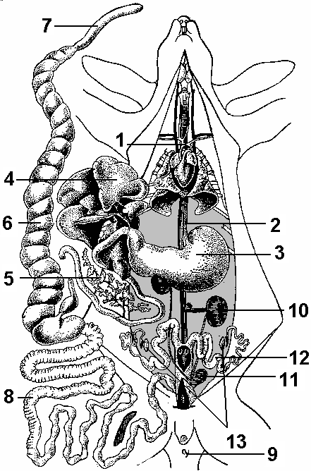 1 — левая дуга аорты; 2 — пищевод; 3 — желудок; 4 — печень; 5 — поджелудочная железа; 6 — слепая кишка; 7 — аппендикс; 8 — тонкий кишечник; 12 — яйцеводы (маточные трубы); 13 — яичники.