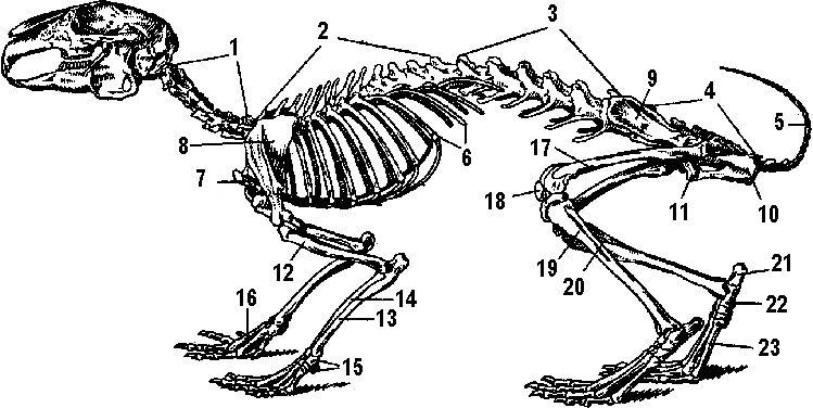 1 — шейный отдел; 2 — грудной отдел; 3 — поясничный отдел; 4 — крестцовый отдел; 5 — хвостовой отдел позвоночника; 6 — ребра; 7 — грудина; 8 — лопатки; 9 — подвздошные кости таза; 10 — седалищные кости таза; 11 — лобковые кости таза; 12 — плечевая кость; 13 — локтевая кость предплечья; 14 — лучевая кость предплечья; 15 — кости запястья; 16 — кости пясти; 17 — бедренная кость; 18 — коленная чашечка; 19 — большая берцовая кость; 20 — малая берцовая кость; 21 — пяточная кость; 22 — кости предплюсны (таранная кость); 23 — кости плюсны.