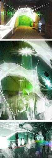 стены. И эти объемы - летящие, их можно плоскостями набирать, этот способ гораздо проще, но мощно выглядит, такая слоистость получается. Лазерные лучи рассекают пространство, образы, ритмы