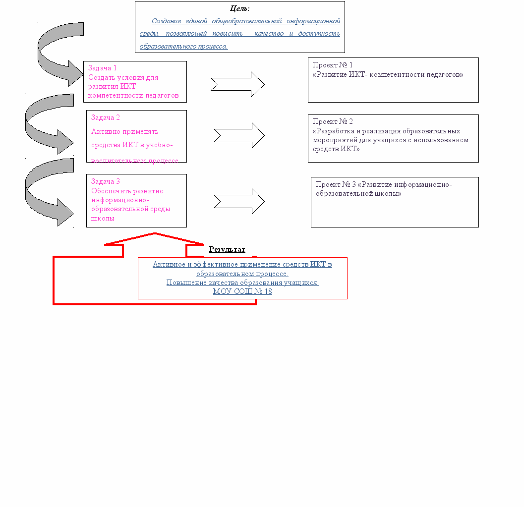 | Техническая и методическая поддержка учителей с недостаточным уровнем ИКТ-компетентности | Индивидуальные консультации, специализированные курсы | 2010-2013 | Зам.директора по УВР | | Повышение ИКТ-компетенции, уровня проведения образовательных мероприятий. | Доля ИКТ-компетентных учителей составляет не менее 50% | ||||