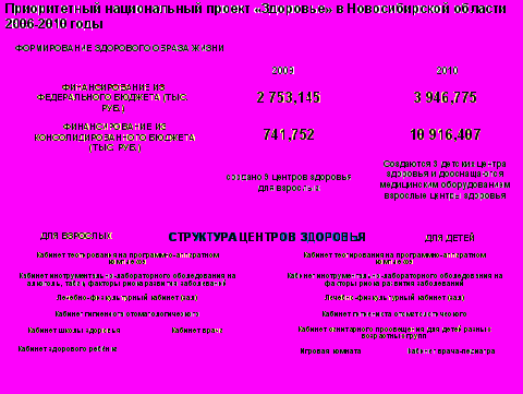 С 1 декабря 2009 года в рамках реализации мероприятий приоритетного национального проекта, направленных на формирование здорового образа жизни у граждан Российской Федерации открыты и функционируют девять центров здоровья для взрослых и 3 центра здоровья для детей.