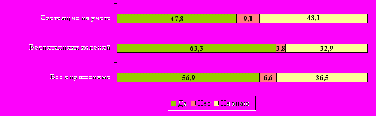 В целом по регионам ситуация примерно одинаковая. В контрольном регионе отмечается наибольший процент подростков, ответивших, что в их семьях недоброжелательные и равнодушные отношения. Однако при этом следует учитывать, что примерно 50% воспитанников воспитательной колонии в РМЭ – это несовершеннолетние преступники из соседней Чувашской Республики. Бросается в глаза, что в Ставропольском крае всего лишь 27% опрошенных оценили семейные взаимоотношения как доверительные, 13,5% - назвали их равнодушными, а большинство ребят предпочли не отвечать на данный вопрос.