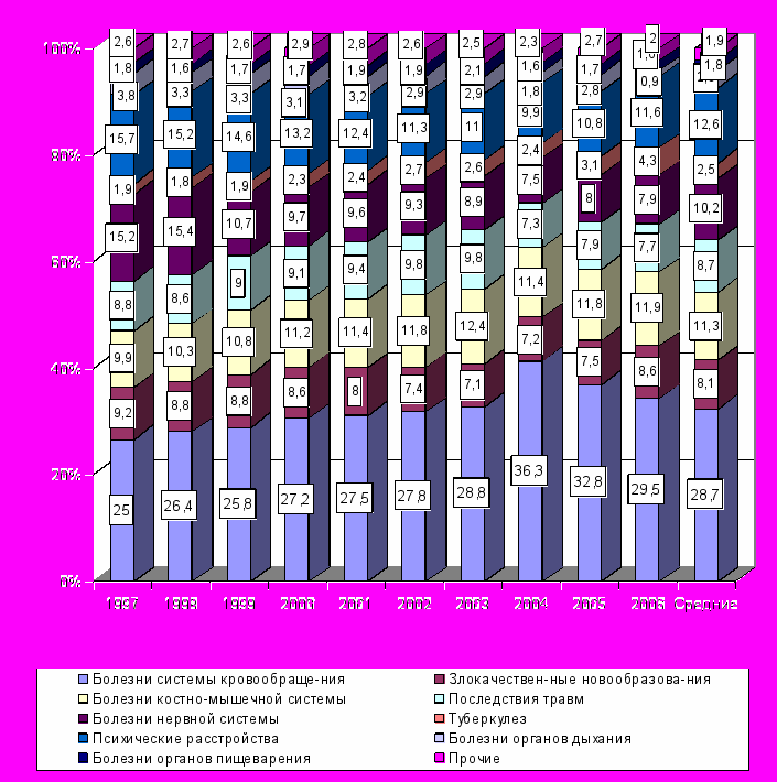 Существенных изменений в структуре причин первичной инвалидности населения области в динамике 10 лет не произошло. Первое ранговое место (1997 - 2006 гг.) занимали болезни системы кровообращения: от 39,3 % в 1997 г. до 53,9 % в 2005 г., средний удельный вес 44,7 % от числа всех причин инвалидности. Второе - злокачественные новообразования (min – 10,9 % в 2005 г.; max. – 14,0 % в 2006 г.), средний – 12,3%. Третье, четвертое и пятое ранговые места в разные годы делили три класса болезней: костно-мышечной системы (min – 7,7 % в 1999 г.; max. – 9,6 % в 2006 г.); последствия травм (min – 5,1 % в 2005 г.; max. – 9,0 % в 2000 г.) и болезни нервной системы (min – 4,1 % в 2004 г.; max. – 12,4 % в 1998 г.). В 2005 г. среди причин инвалидности наиболее существенно вырос удельный вес болезней системы кровообращения - до 53,9 %, что и было связано с возросшим числом медико-социальных освидетельствований лиц пожилого возраста.