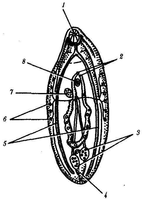 Рис. 20.1. Организация сосальщиков: 1—ротовая присоска, 2—мужские и женские половые отверстия; 3—семенники; 4—мочевой пузырь; 5—ветви кишечника, 6—желточники; 6—яичник; 8—брюшная присоска