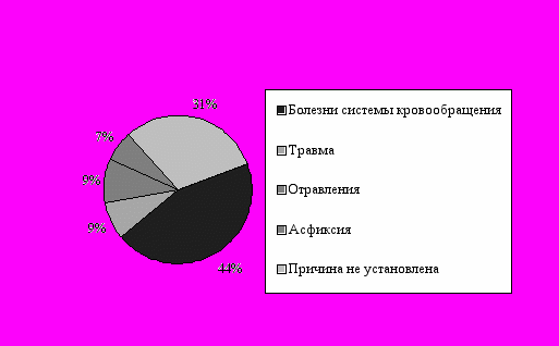 ыла сделана попытка прогнозирования исхода реанимационных мероприятий с выявлением факторов, влияющих на прогноз. С этой целью сравнивались по информативности показатели, которые, по нашему опыту, оказывают влияние на эффективность реанимационных мероприятий: возраст, пол, время смерти (до приезда СМП или в ее присутствии), причина смерти, вид остановки сердца (фибрилляция, электромеханическая диссоциация или асистолия), кем начата реанимация (линейной или реанимационной бригадой). Взаимосвязь между данными показателями представлена в табл. 11.Рис. 7. Причины смерти на догоспитальном этапе в Петрозаводске