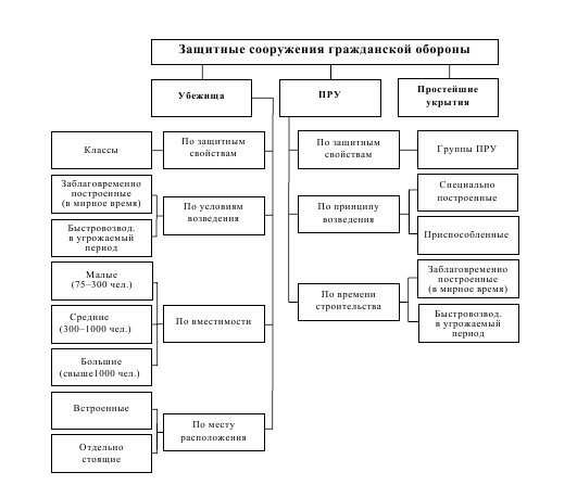 ЗС разделяются на убежища, противорадиационные укрытия (ПРУ) и простейшие укрытия (ПУ). Классификация защитных сооружений дана на рис.3.