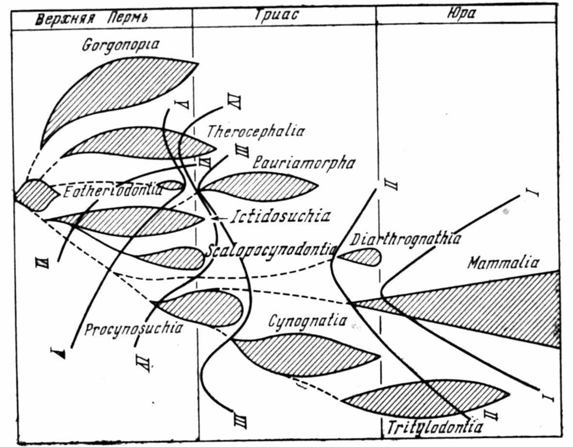 Процесс «маммализации» охватил несколько эволюционных линий зверообразных рептилий. В основных группах териодонтов параллельно формируются такие признаки млекопитающих, как верхние обонятельные раковины, трехбугорчатые коренные зубы, расширенные большие полушария головного мозга, мягкие губы и дополнительное челюстное сочленение. Триасовые цинодонты и бауриморфы приобрели полное вторичное нёбо и маммальную постановку ног. У них редуцировалось рептильное челюстное сочленение (рис. 17). Некоторые исследователи считают, что высшие териодонты были теплокровными и имели шерстяной покров. Древнейшие млекопитающие, появившиеся в позднем триасе, делятся на две группы, одна из которых дала начало сумчатым и плацентарным, а другая — триконодонтам, докодонтам, многобугорчатым и однопроходным. В этих группах независимо осуществлялся переход от двойного челюстного сочленения к одинарному. Л. П. Татаринов (1975) полагает, что маммализация продолжалась в течение всего мезозоя и лишь в кайнозое был достигнут телэнцефалический уровень развития головного мозга, характеризующийся резким расширением больших полушарий.