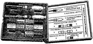 В гнезде 1 имеется шприц-тюбик (с красным колпачком), содержащий антидот (противоядие) против фосфорорганических отравляющих веществ (VX, зарин, зоман). Гнездо 2 - резервное, оно в некоторых аптечках может иметь такой же шприц-тюбик, как в гнезде 1. Вместо шприц тюбиков в гнездах 1 и 2 могут быть вложены шприцы автоматические многоразового пользования с несколькими насадочными частями, содержащими антидот против фосфорорганических отравляющих веществ. В гнезде 3 находится шприц-тюбик (с белым колпачком), содержащий противоболевое средство, которое вводится под кожу для уменьшения боли при ранениях, ожогах и переломах. В гнезде 4 в двух пеналах малинового цвета содержится 12 таблеток радиозащитного средства. При угрозе облучения проникающей радиацией, при действиях на местности, зараженной радиоактивными продуктами ядерного взрыва, принимается сразу шесть таблеток. Эта доза эффективна в течение 4–5 ч. Если действия и дальше будут продолжаться на зараженной местности, необходимо принять остальные шесть таблеток. В гнезде 5 в двух белых пеналах прямоугольной формы содержится по восемь таблеток противобактериального средства. При ранениях, ожогах или угрозе бактериологического (биологического) заражения принимается одновременно восемь таблеток препарата, через 6–8 ч – повторно восемь таблеток из второго пенала. Гнездо 6 – резервное. В гнезде 7 в круглом ребристом пенале голубого цвета содержатся таблетки этаперазина – противорвотного средства. Его принимают по одной таблетке в случаях появления признаков первичной реакции на радиоактивное облучение (тошнота, рвота), а также при возникновении этих расстройств в результате контузии или ранения. Масса аптечки 100 г. В холодное время года аптечку рекомендуется носить в нагрудном кармане обмундирования для предупреждения замерзания жидких лекарственных средств. Лекарственные средства, содержащиеся в аптечке, применяют в зависимости от показаний как по указанию командира (старшего), так и самостоятельно в соответствии с инструкциями, которые доводят до личного состава в процессе военно-медицинской подготовки. Самостоятельно при наличии показаний применяют следующие лекарственные средства: средство при отравлении ФОВ - при первых признаках поражения; противоболевое средство - при травмах и ожогах, сопровождающихся сильными болями; противобактериальное средство - при ранениях и ожогах; противорвотное средство - при появлении тошноты, вызванной воздействием ионизирующих излучений, а также контузиями и другими факторами. Только по команде (указанию) командира применяют: радиозащитное средство; противобактериальное средство - при опасности заражения возбудителями инфекционных заболеваний; профилактическое средство от отравления ФОВ (таблетки) - в предвидении внезапного применения химического оружия противником; противорвотное средство - в предвидении воздействия радиации в больших дозах.