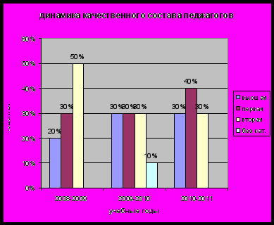 Важным направлением своей деятельности мы считаем постоянное повышение и совершенствование педагогического мастерства. Для этого организуются консультации, семинары-практикумы, работает методическое объединение воспитателей ДОУ. В этом году проведено 4 заседания, 15 открытых просмотров внутри детского сада, 2 открытых занятия дано на районном уровне. Воспитатели проходят курсы в институте развития образования, повышают уровень квалификации через прохождение аттестации ( 2 педагога). Ежегодно прослеживается положительная динамика качественного состава педагогов.