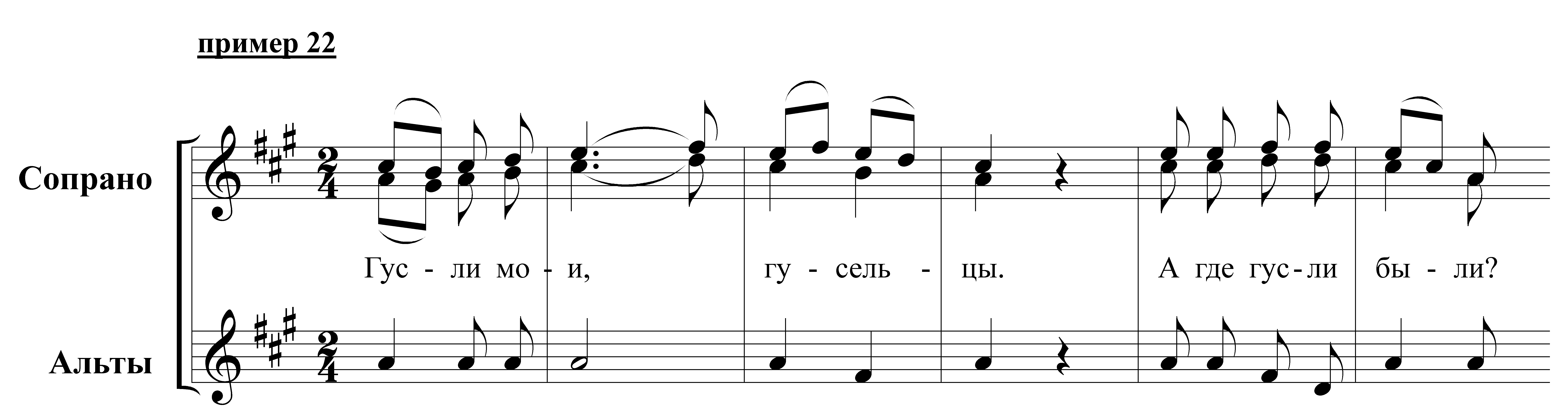 ор «Гусли, мои гусельцы» – это весёлая плясовая песня (пример 22). В оркестровом сопровождении имитируется звучность народных инструментов.