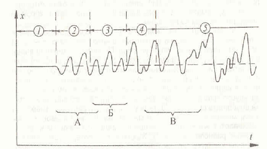 Например, устойчивый установившийся природный процесс может резко смениться другим процессом (т.е. первый процесс может исчезнуть), либо столкнувшись с неустойчивым режимом, либо вследствие нарастания самоподдерживающихся колебаний [1]. Следовательно, намечается определенная последовательность в появлении хаотических колебаний (рис.3): мягкая потеря устойчивости (А) - удвоение периода колебаний (Б) — удвоенный цикл - аттрактор (В).