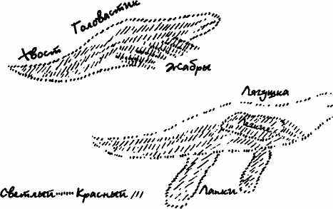 Теперь я хочу нарисовать вам все это по пунктам: вот животное оттягивает свои сосуды из жабр, они все более истончаются, и эти сосуды оно ткет уже здесь. Вот животное сплетает свои собственные сосуды, которые вначале были вынесены в жабры. А сосуды, проходившие через хвост, оно оттягивает назад; здесь вырастают лапы; те же самые сосуды, которые проходили в хвосте, идут в лапы.... (неясное место в перепечатке), и там они сплетаются иначе, нежели когда они проходили в хвосте. Это вы можете наблюдать в природе: это головастик, а это — лягушка! Лягушка сперва является головастиком с хвостом и жабрами и может жить в воде. Когда же она оказывается на воздухе, то она внутренне проделывает то же самое, что гусеница проделывает снаружи. Головастик, являющийся лягушкой, которая может жить в воде, из своей собственной кровеносной сети создает сеть, которая внедряется внутрь, из того, что проходило в сосудах и жабрах, создаются теперь легкие. Здесь это было жабрами, и благодаря тому, что животное