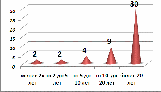 В соответствии с возрастным составом, 2 учителя имеют стаж работы менее 2-х лет, 2 - от 2 до 5 лет, 4 - от 5 до 10 лет, 9-от 10 до 20 лет, 30-более 20 лет.