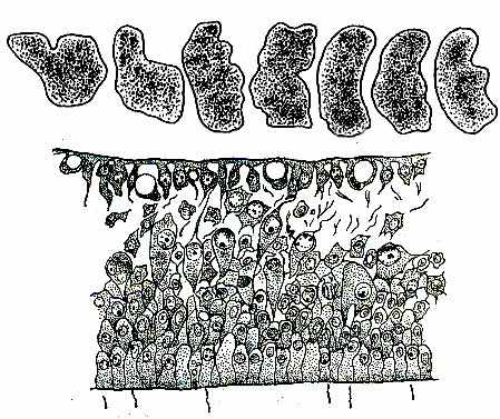 1 — чувствительная клетка; 2 — стрекательная клетка; 3 — молодая стрекательная клетка; 4 — интерстициальные клетки; 5 — нервные клетки; 6 — эпителиально-мускульные клетки энтодермы; 7 — железистые клетки; 8 — энтодерма; 9 — базальная мембрана; 10 — эктодерма; 11 — эпителиально-мускульные клетки эктодермы.