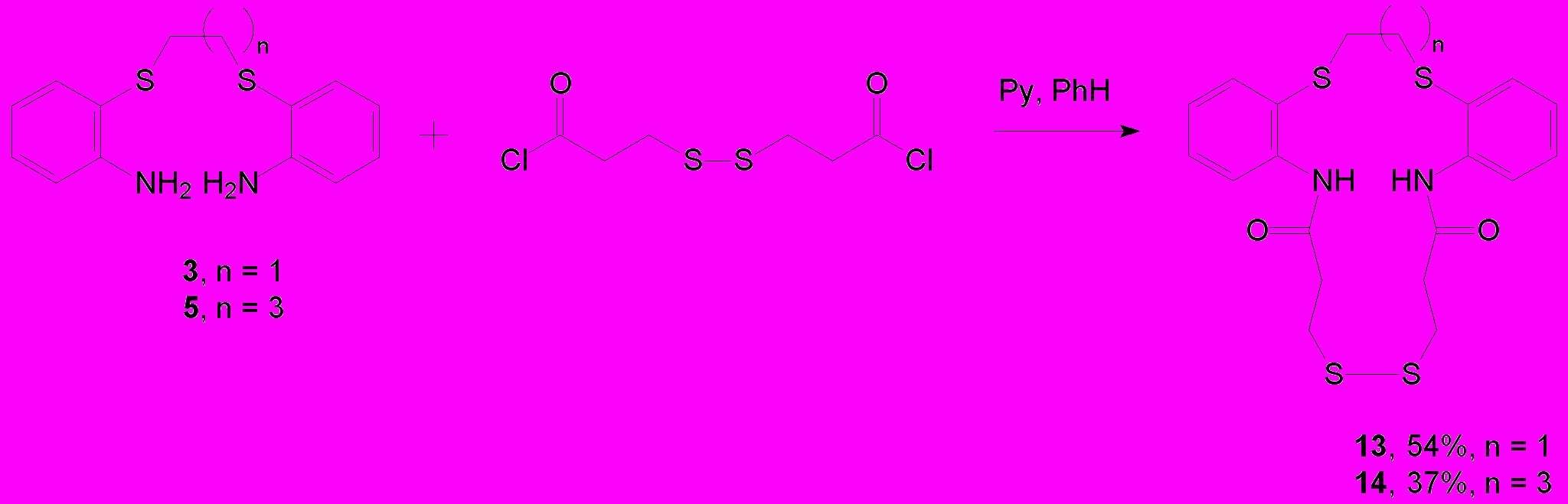 Для синтеза макроциклических диамидов, содержащих дисульфидный фрагмент, мы провели реакцию между диаминами 3 и 5 и дихлорангидридом 3,3'-дитиодипропионовой кислоты; во избежание образования полимерных продуктов реакцию проводили при большом разбавлении и одновременном добавлении растворов реагентов: