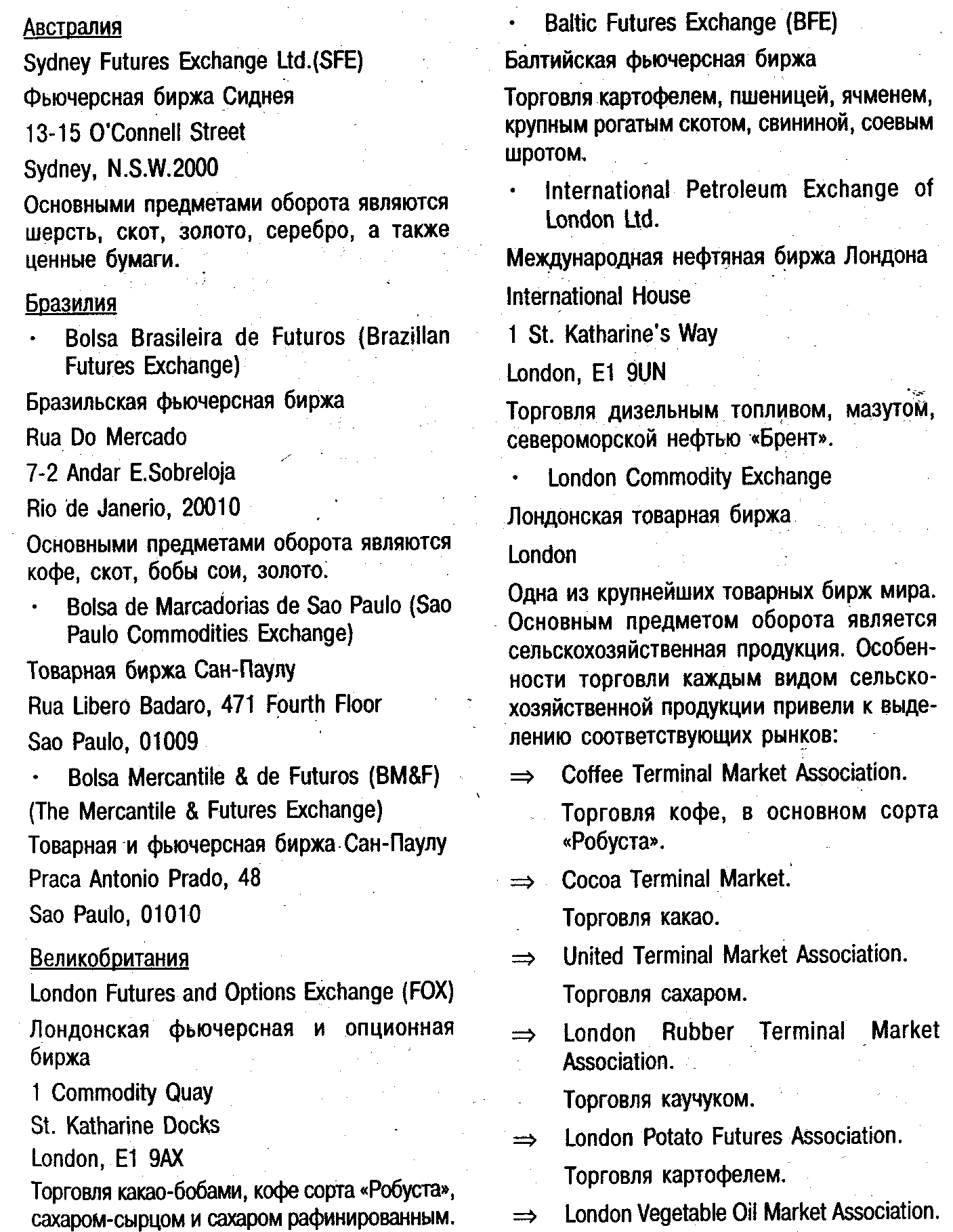 К крупнейшим мировым товарным биржам относятся Лондонская биржа металлов, Чикагская торговая палата, Чикагская товарная биржа. Нью-йоркская товарная биржа. Французская международная фьючерсная биржа. Ниже приведен перечень основных товарных бирж.