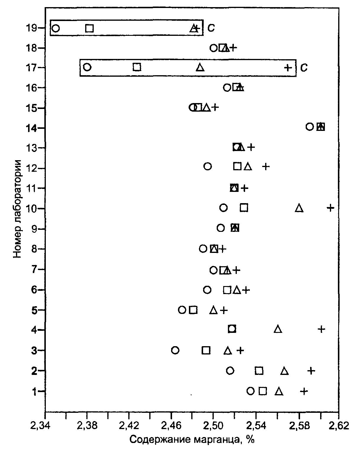 Примечание - Точки в прямоугольных рамках означают, что результаты измерений были идентифицированы как выбросы согласно критерию Кохрена (C).
