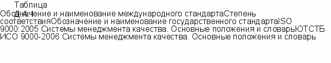 Библиография [1] ISO 9004:-1 [2] ISO 10001:2007 [3] ISO 10002:2004 [4] ISO 10003:2007 [5] ISO 10005:2005 [6] ISO 10006:2003 [7] ISO 10007:2003 [8] ISO 10012:2003 [9] ISO/TR 10013:2001 [10] ISO 10014:2006 [11] ISO 10015:1999 [12] ISO/TR 10017:2003 [13] ISO 10019:2005 Managing for the sustained success of an organization - A quality management approach (Менеджмент для достижения устойчивого успеха. Подход с позиции менеджмента качества) Quality management - Customer satisfaction - Guidelines for codes of conduct for organizations (Менеджмент качества. Удовлетворенность потребителей. Руководство, касающееся кодексов поведения организаций) Quality management - Customer satisfaction - Guidelines for complaints handling in organizations (Менеджмент качества. Удовлетворенность потребителей. Руководство по обращению с жалобами потребителей в организациях) Quality management - Customer satisfaction - Guidelines for dispute resolution external to organizations (Менеджмент качества. Удовлетворенность потребителей. Руководство по разрешению споров вне организаций) Quality management systems - Guidelines for quality plans (Системы менеджмента качества. Руководство по программам качества) Quality management systems - Guidelines for quality management in projects (Системы менеджмента качества. Руководство по менеджменту качества проектов) Quality management systems - Guidelines for configuration management (Системы менеджмента качества. Руководство по менеджменту конфигурации) Measurement management systems - Requirements for measurement processes and measuring equipment (Системы управления измерениями. Требования к процессам измерения и измерительному оборудованию) Guidelines for quality management system documentation (Руководство по документированию системы менеджмента качества) Quality management - Guidelines for realizing financial and economic benefits (Менеджмент качества. Руководство по реализации финансовых и экономических преимуществ) Quality management - Guidelines for training (Менеджмент качества. Руководство по обучению) Guidance on statistical techniques for ISO 9001:2000 (Руководство по статистическим методам применительно к ISO 9001:2000) Guidelines for the selection of quality management system consultants and use of their (Руководство по выбору консультантов системы менеджмента качества и использованию их услуг) На стадии пересмотра (взамен ISO 9004:2000). [17] [18] [19] [20] [21] [22] [23] [14] ISO 14001:2004 Environmental management systems - Requirements with guidance for use (Системы экологического менеджмента. Требования и руководство по применению) [15] ISO 19001:2002 Guidelines for quality and/or environmental management systems auditing (Оборудование медицинское для диагностики in vitro. Информация, предоставляемая изготовителем, вместе с реактивами диагностики in vitro для окрашивания, применяемого в биологии) [16] IEC 60300-1:2003 Dependability management - Part 1: Dependability management systems (Управление надежностью. Часть 1. Системы управления надежностью) IEC 61160:2006 Design review (Анализ проекта) ISO/IEC 90003:2004 Software engineering - Guidelines for the application of ISO 9001:2000 to computer software (Разработка программного обеспечения. Руководство по применению ISO 9001:2000 к компьютерному программному обеспечению) Quality management principles2, ISO, 2001 (Принципы менеджмента качества) ISO 9000 - Selection and use2, ISO, 2008 (Выбор и применение стандартов ISO серии 9000) ISO 9001 for Small Businesses - What to do; Advice from ISO/ТС 1763, ISO, 2002 (ISO 9001 для малого бизнеса. Что делать) Ссылки на вебсайты: ISO Management Systems4 (Системы менеджмента ISO) ссылка скрыта; ссылка скрытассылка скрыта; ссылка скрыта. iso. org/tc 176/sc2; ссылка скрыта Приложение Д.А (справочное) ![]() Сведения о соответствии государственного стандарта ссылочному международному стандарту | |||||||||||||||||||||||||||||||||||||||||||||||||||||||||||||||||||||||||||||||||||||||||||||||||||||||||||||||||||||||||||||||