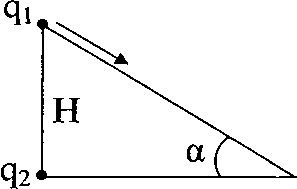 Небольшое заряженное тело начинает скользить без трения по наклонной плоскости с высоты #=40 см. Масса тела ю = 60г, его заряд положителен и равен qu угол а = 30°. В вершине прямого угла находится точечный отрицательный заряд q2 = -3 мкКл. Считать, что взаимодействие зарядов происходит в вакууме. Если кинетическая энергия тела в нижней точке наклонной плоскости равна W— 40 мДж, то заряд q\ тела равен ... мкКл. {Ответ округлите до целого).