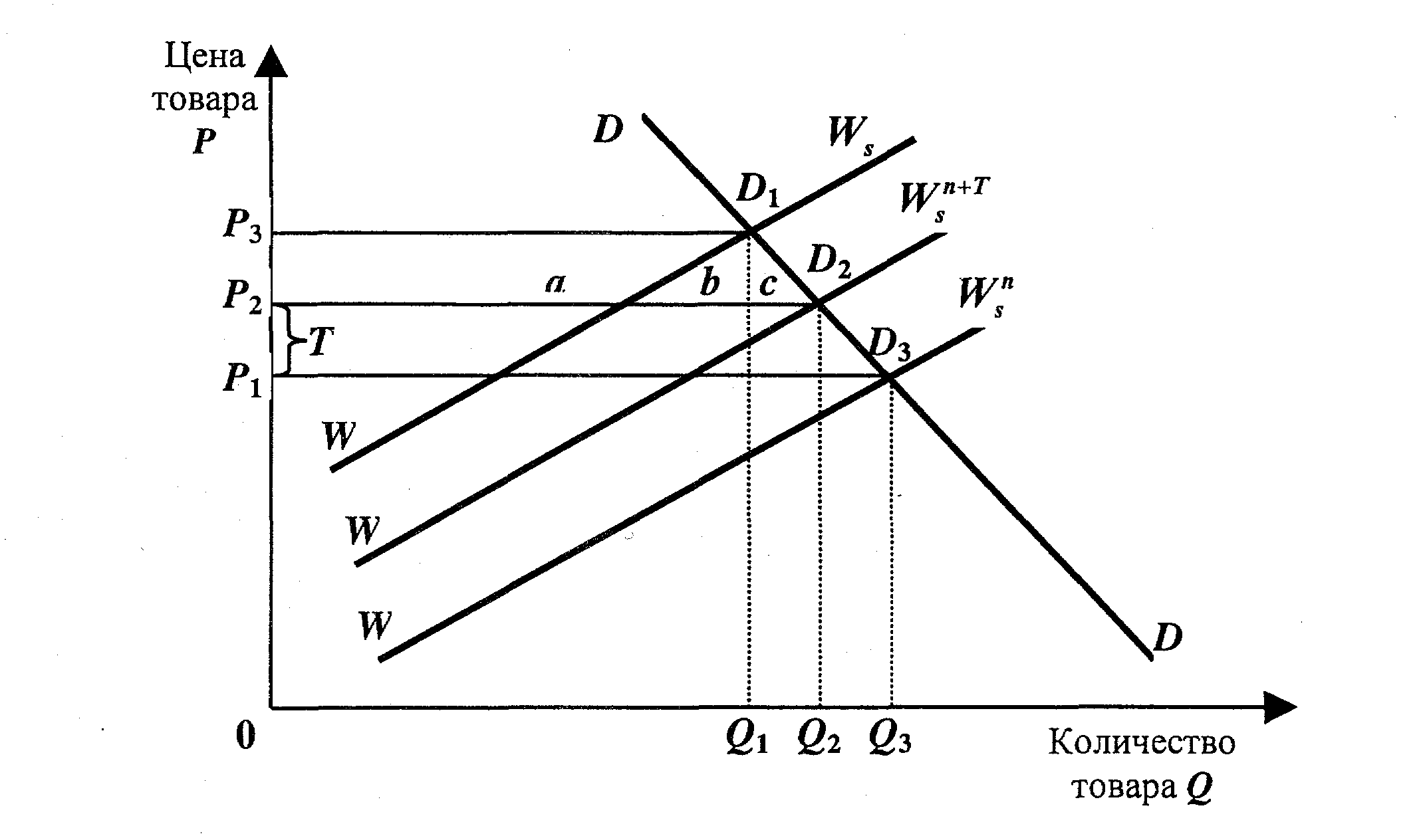 На графике линия WWs обозначает динамику предложения товара на мировом рынке до момента введения таможенного тарифа; линия WW