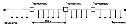 Простейшее из коммуникационных устройств - повторитель (repeator). Повторитель физически соединяет различные сегменты кабеля локальной сети. И делается это с целью увеличения общей длины сети.